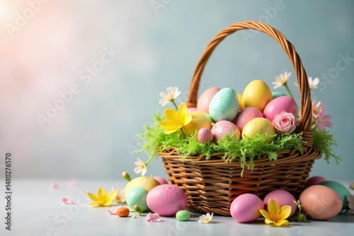 A colorful Easter egg basket overflowing with decorated eggs, candy, and spring flowers , spring, springtime basket