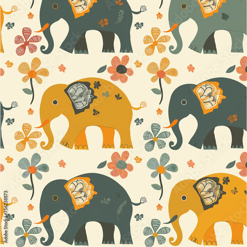 A colorful elephant drawing with flowers in the background