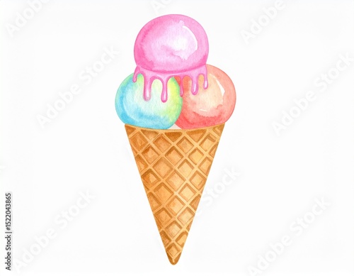 A colorful ice cream cone with three scoops of various flavors. A delicious and refreshing summer treat.