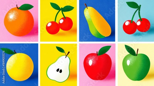 A colorful image of various fruits, including apples, oranges, and cherries. The fruits are arranged in a grid pattern, with each fruit having a different color. Scene is cheerful and vibrant