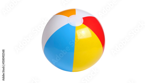 A colorful inflatable beach ball with red, blue, yellow, orange, and white segments isolated on solid white background
