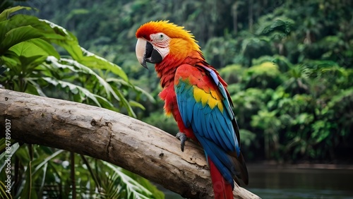 A colorful macaw perched on a branch overlooking a vast river snaking through the lush rainforest.