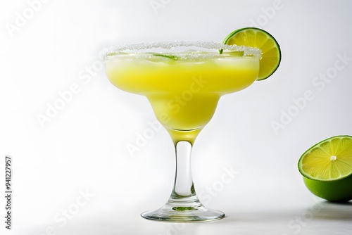 A colorful margarita in a salted rim glass with a lime wedge on a white background, AI Generated