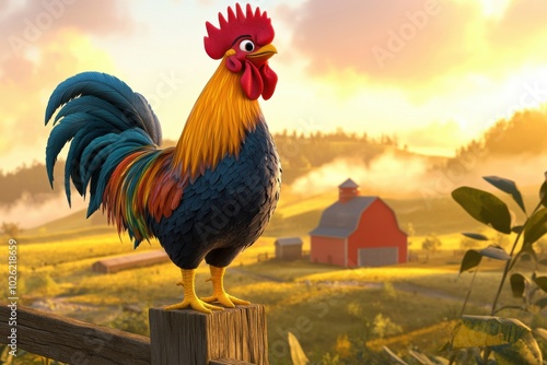 A colorful rooster stands proudly on a fence post against a picturesque farm backdrop at sunrise.