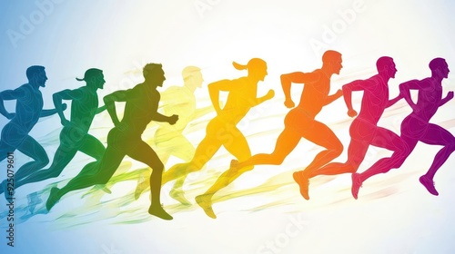 A colorful silhouette of sprinters in midrace, each figure filled with vibrant gradient colors, abstract, dynamic motion, bright background, high contrast