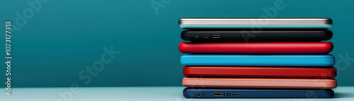A colorful stack of smartphones resting on a surface against a teal background, showcasing a variety of designs and colors.