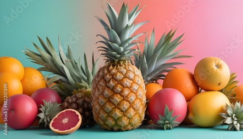 A colorful still life arrangement featuring a pineapple and some other fruits
