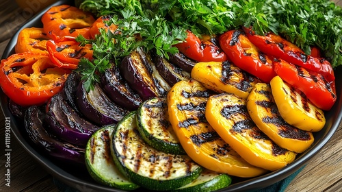 A colorful vegetable symphony with grilled eggplant, zucchini, and yellow peppers artistically arranged on a platter, Generative AI