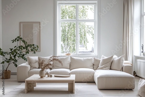 A combination of modern Scandinavian and minimalist interiors in the living room with windows and a view of the sofa and table. Generative AI