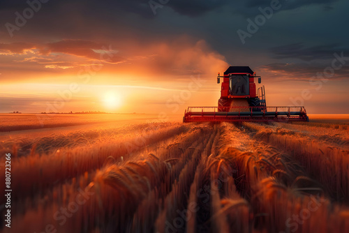 A combine harvester working in a golden wheat field under a dramatic sunset, illustrating the beauty of agricultural life and rural landscapes.