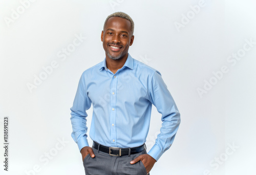 A commercial portrait photo of a model on a white studio background: a man in a blue shirt and grey pants with his hands in his pockets, smiling against a white background.