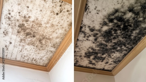 A comparison of different ceiling stains, from light discoloration to severe black mold.