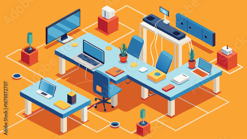 A computer desk with a laptop, a keyboard, a mouse, and a monitor. The desk is set up for work or study