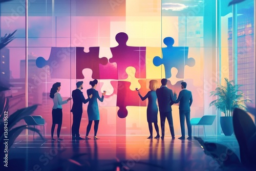 A conceptual digital illustration of a group of business professionals putting puzzle pieces together, diverse office environment, teamwork theme.