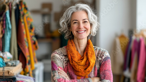 A confident woman with curly gray hair smiles warmly while wearing colorful sweater and an orange scarf. She stands in vibrant workspace filled with textiles and clothing