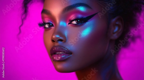 A confident young black woman with dramatic makeup against a stylish purple backdrop, ideal for beauty campaigns, fashion editorials, and empowerment-themed events.