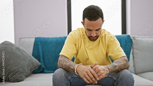 A contemplative tattooed man sits on a couch, his casual appearance and the cozy room creating a relaxed atmosphere.
