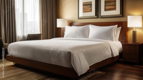 A contemporary hotel suite featuring a plush queen bed, deep eucalyptus walls, and polished wooden flooring, offering a refined yet inviting atmosphere.