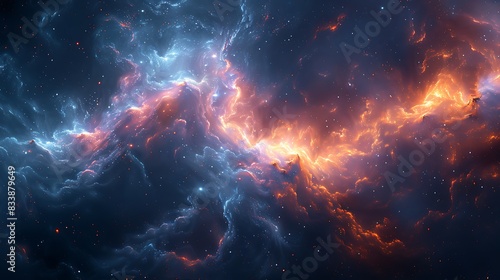 A cosmic abstract, stars twinkling amidst a nebula, swirling blues and purples, ethereal light scattering through cosmic dust, intricate and mesmerizing patterns, vivid colors.