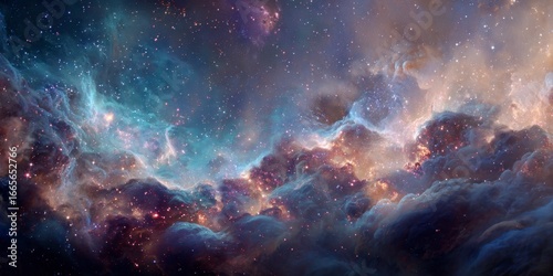 A cosmic view of a nebula featuring clusters of stars amid swirls of purplishblue and gold creating a celestial panorama