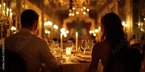 A couple enjoying a candlelit dinner at an expensive restaurant with a lavish interior.