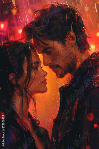 A couple of lovers, an attractive man and woman passionately embrace each other in the summer rain, ready to kiss. Cover of a book about love, illustration for a romance novel.