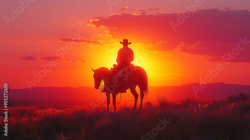 A cowboy is riding a horse in a field with a beautiful sunset in the background
