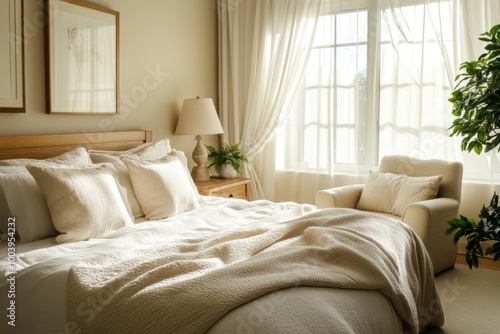 A cozy bedroom with a bed made with soft bedding and a throw blanket.