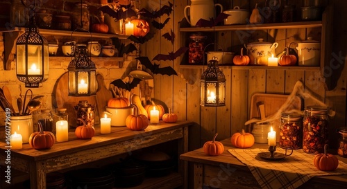 A cozy candlelit Halloween kitchen with pumpkins jars lanterns and bat decorations