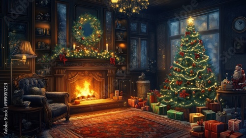 A Cozy Christmas Evening in a Luxurious Home with a Decorated Tree and a Fire in the Fireplace