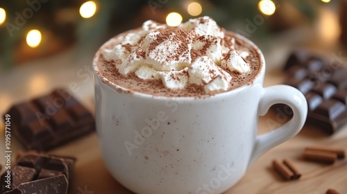 A cozy cup of hot chocolate topped with whipped cream and chocolate shavings.