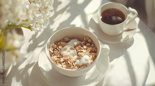 A Cozy Morning Scene Featuring a Bowl of Oatmeal with Yogurt and a Cup of Coffee on a Bright Table, Surrounded by Soft Light and Fresh Flowers