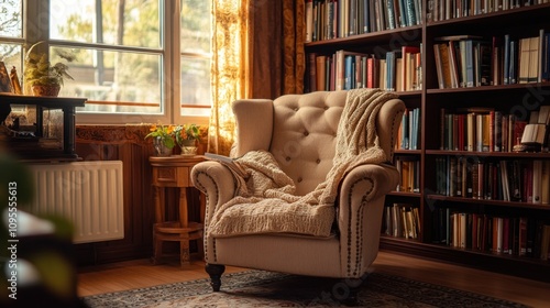 A Cozy Reading Nook with a Plush Armchair and a Bookshelf Filled with Books