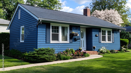 A cozy suburban home features freshly painted blue siding surrounded by vibrant flowers and lush green grass under a sunny sky