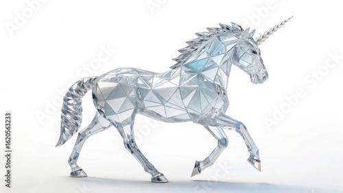 A crystalline unicorn with a horn mid stride on a white background in a studio shot rendering