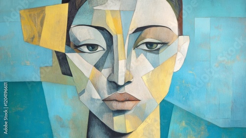 A cubist-inspired portrait with fragmented shapes in muted blues and yellows