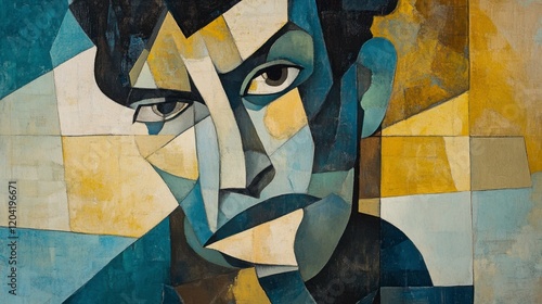 A cubist-inspired portrait with fragmented shapes in muted blues and yellows