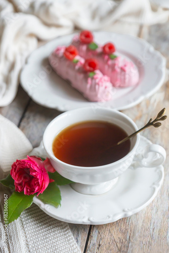 A cup of aromatic, hot tea and raspberry eclairs on a light table.