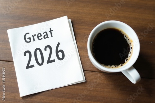 A cup of coffee sitting next to a paper with 'great 2016' written on it..New Year 2026.