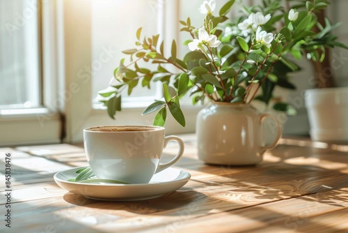 A cup of coffee with creamy froth sits on a sunny table with a blooming bouquet in a ceramic vase in the background