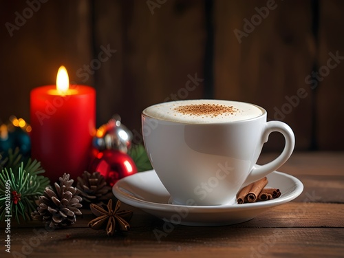 A Cup of Latte on a Wooden Table with Christmas Decorations - Perfect for Coffee Shops, Home Decor, and Christmas Gifts