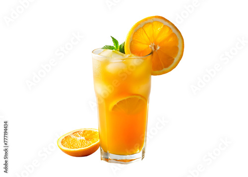 A cup of orange juice with slices orange on transparent background