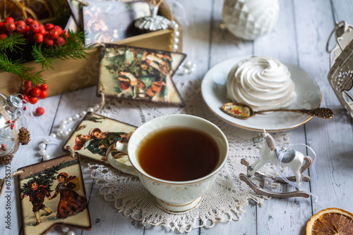 A cup of tea, New Year's toys, a calendar for the New Year 2024. Still life in vintage style.