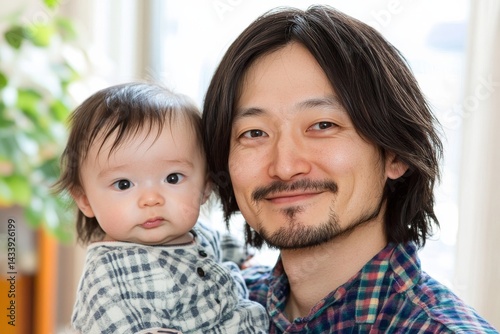 A curly-haired father, beaming with joy, holds his newborn son close in the comfort of their bedroom, symbolizing the beauty of fatherhood