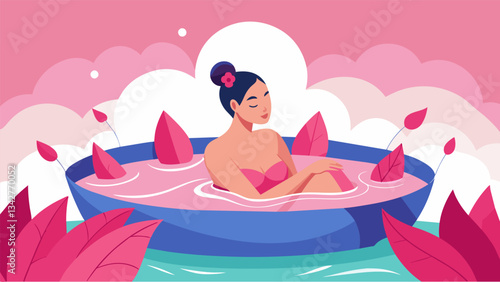 A customer at a spa luxuriates in a rose petalinfused thermal bath the delicate scent and heat melting away her worries.. Vector illustration