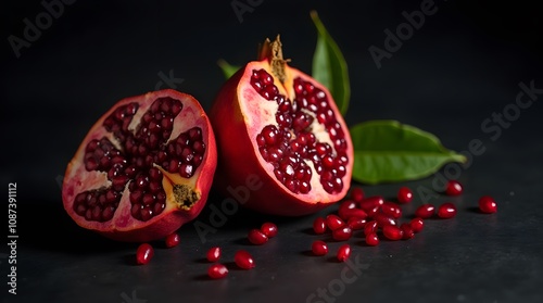 A cut ripe pomegranate lies on a dark table, with grenades scattered nearby. Cut pomegranate fruit. Pomegranate berry.