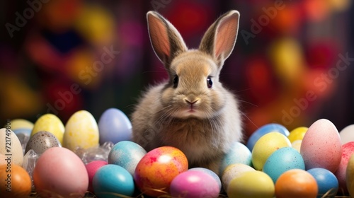 A cute Easter bunny among the colored Easter eggs. One funny, fluffy rabbit and many colorful eggs. Easter holiday.
