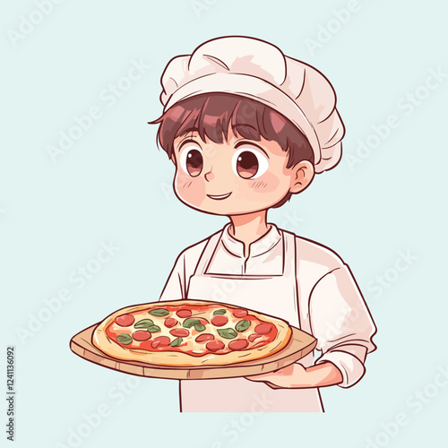 A cute little boy hold pizzawear chef uniform vector illustration