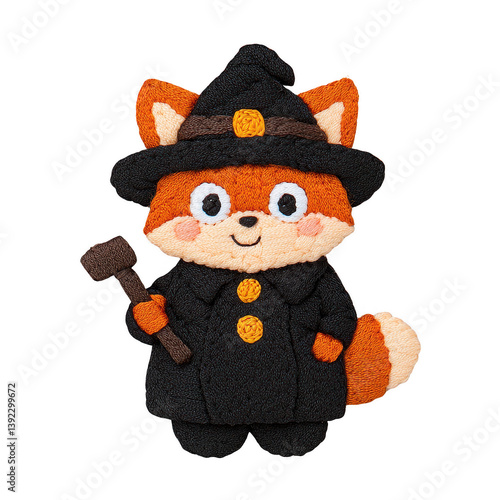 A cute plush fox character dressed as a witch, holding a hammer, with detailed textures, set against a white isolated background.