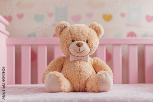 a cute teddy bear toy sitting on a pink crib in a kids room